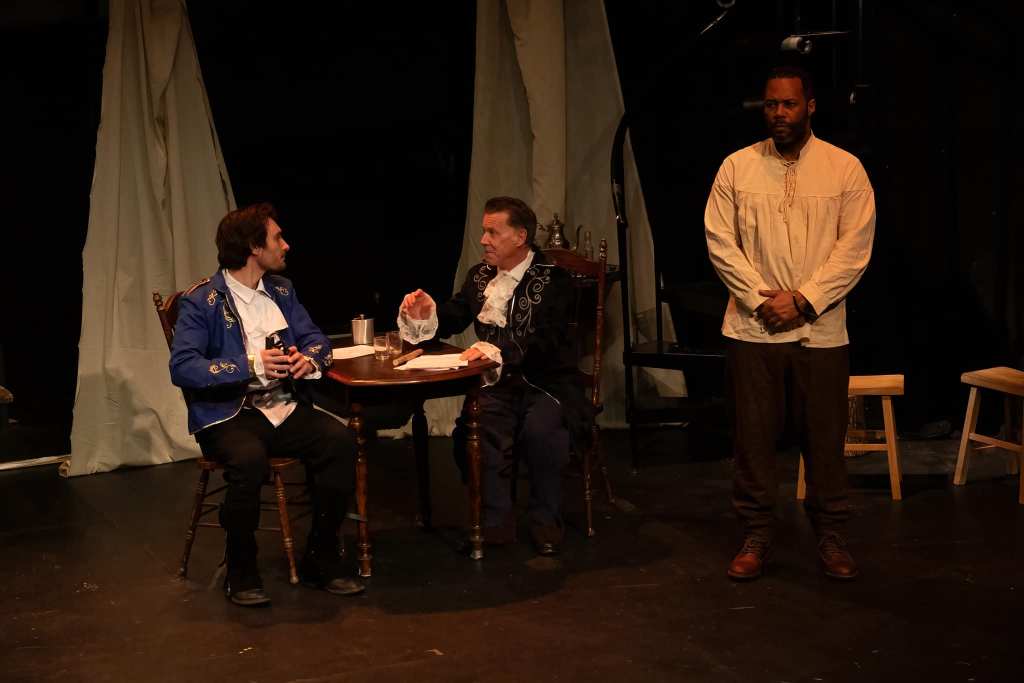 York is portrayed with astonishing power and authenticity by Rommell Sermons, who we see discussing his being chosen for the expedition with his wife Reeva (Marsha St. Julien; portrayed later in the run by Zsay Moore). Reeva is deeply unhappy with the idea of York going into certain danger with his white oppressors. Though York is loyal to Clark (Nicholas Dodge) because “Clark is loyal to him”, Reeva is much more skeptical about the nature of the relationship, a foreshadowing that will lead to a devastating revelation at the end of the play. Indeed, Clark seems somewhat benevolent, especially in contrast to Lewis (Travis Bergmann). Lewis here is seen to be a raging bigot, seething with contempt for York and threatening him with the whip at every opportunity (despite not having the “authority” to do so), something his “master” Clark has never done. Lewis is out for fortune and glory while Clark purports to be more nobly motivated by the chance to grow and unite the young country.