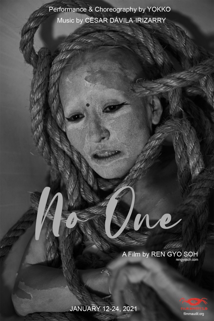 Since its origins last century in Japan, butoh has occupied a unique territory of performance frequently overlapping with the immediate and the cosmic. Perhaps due to the slow time-signatures frequently permeating this form, butoh alters the consciousness of the audience, allowing each viewer the opportunity for greater attention to detail, from the delicate movements of the body to the archetypal power of the images themselves. And while butoh performances have been extensively documented in photography for decades, there is something particularly poignant about viewing Ren Gyo Soh´s No One during our ongoing global pandemic. Covid-19 has torn through the fabric of many communities–economically, politically, physically–and this 20-minute butoh film latches its fingers into this breach, powerfully expressing what many of us feel and long for.