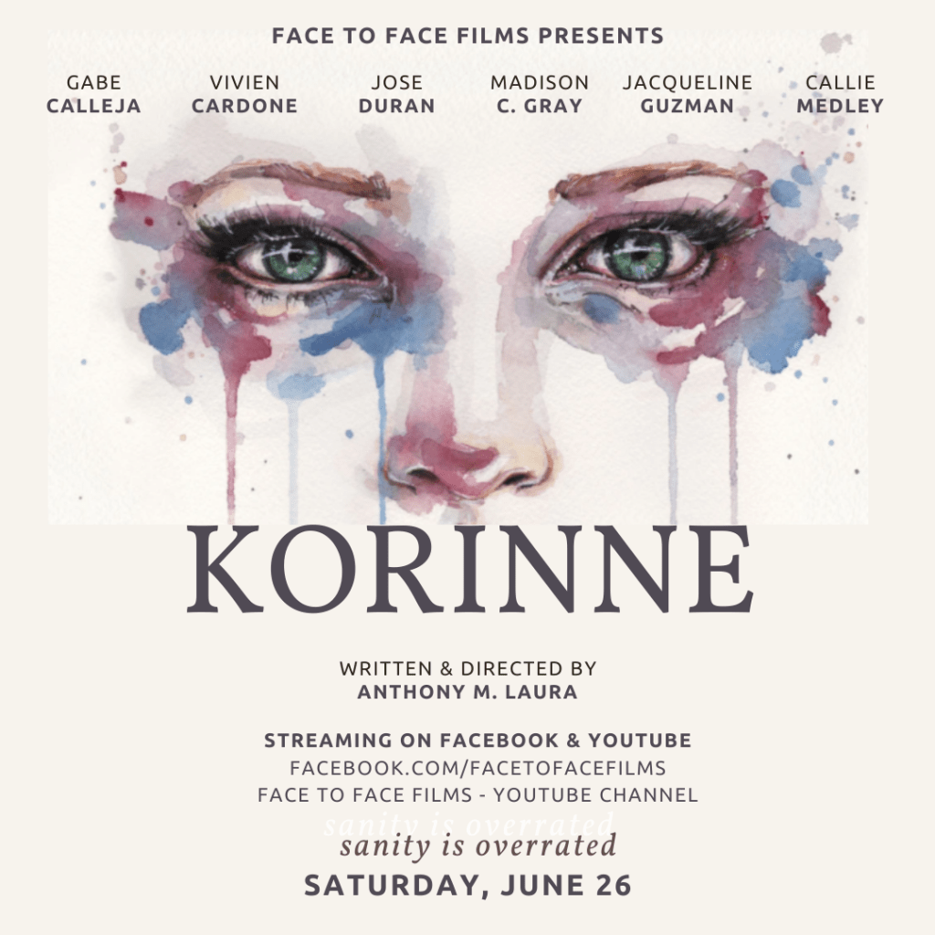 Korinne, a drama involving mental illness, written by Anthony Laura, featuring C Gabe Calleja, Vivien Cardone, Jose Duran, Madison C. Gray, Jacqueline Guzman, and Callie Medley, will air on YouTube, Saturday, June 26, at 2:00 p.m.