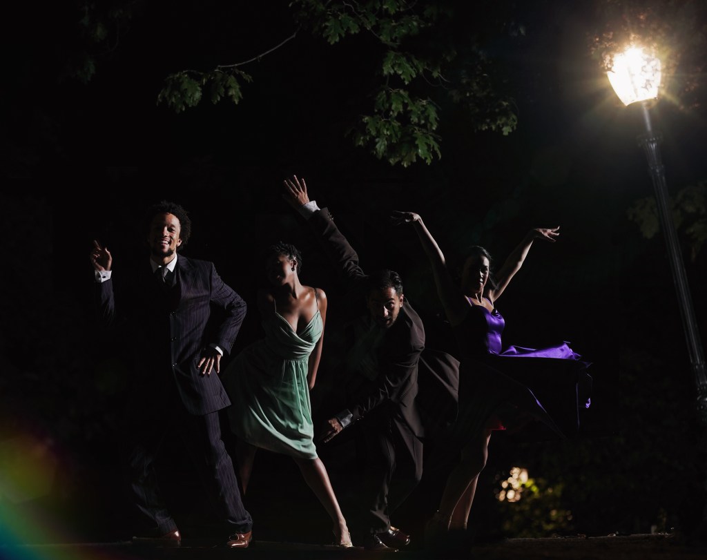 Kaitana: Several synchronistic events came together as magically as the characters and the circumstances in the play itself. During the pandemic, we moved near family to a little town in northern Georgia that sits in a national forest. To keep ourselves connected to our love and sanity, we hosted a weekly virtual gathering of actors where we read full plays, one of which was A Midsummer Night’s Dream. Not long after, I was outside on my porch as this summer storm rolled through. I listened to the sounds of the birds as they quieted with the dimming sky and the sound of thunder in the distance. I was reminded of the suspenseful feeling of being in a theater and hearing the orchestra warm up before the lights dim and the curtain opens. I saw this hazy clearing within the forest, the sounds of nature becoming sweet melodies of a saxophone, with thunderous rhythms of drums, and a singer crooning effortlessly. I saw fairies dancing, aerialists dangling within the trees, and a jazz band swinging hard. I just started seeing it. The characters and the whimsical plot lines unfolding.