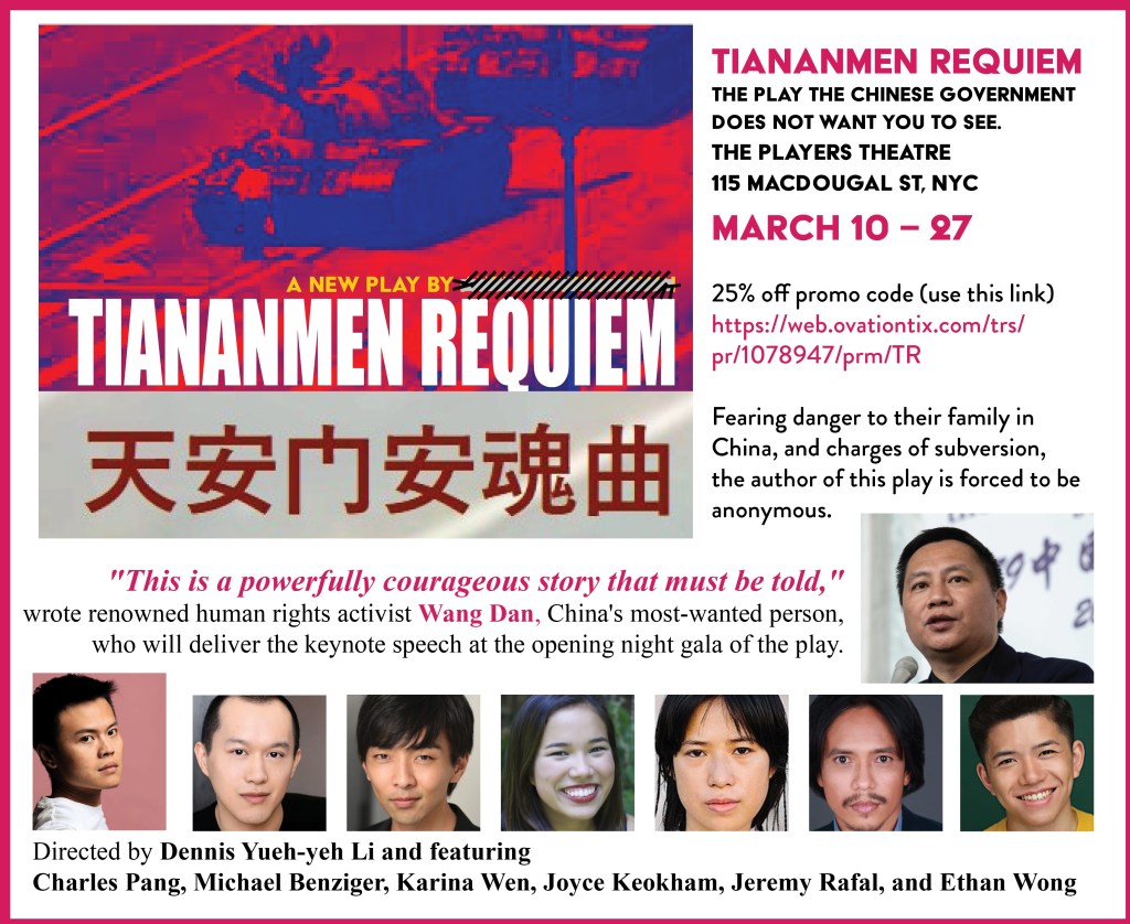 Toney A. Brown & Marc Levine have taken over the role of producers with sponsors Wang Dan (Dialog China) and Rod Lathim joining the team. Dialog China is an organization founded by famed Tiananmen student leader Wang Dan, who was China’s “Most Wanted Man,” was imprisoned twice, and is spending his exile in America as an indefatigable human rights activist. In his endorsement of the play, he wrote on Twitter in Chinese “Seeing those who were not born during the Tiananmen Massacre dedicating themselves to preserving history, makes me incredibly thrilled. Looking at the younger generation, I no longer feel lonely.”