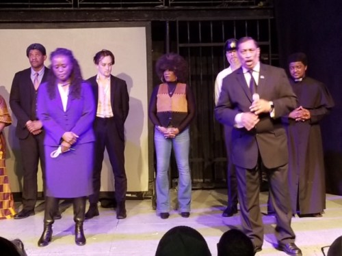 This incredible cast brought the passion and essence of those characters into real time, with Mandela authentically channeled, by the performance of Robert Greene, from the genuine loyalty and camaraderie of Mandela’s team, to the unstoppable determination of wife Winnie Mandela, fiercely played by Malika Nzinga, to the brutally cruel prison warden, John Shortt. And as a person who loves interesting backstories, here are a few. There was an actual tank that was supposed to be used in the production, driven by director John Ruiz Miranda that never made it onstage being an inch too big to make it through the theatre’s doorway. And then when my friend sitting next to me exclaimed “that guy on the stage is my neighbor” I was of course riveted from that point on to actor Lamine Thiam a multi dimensional performer, originally from Senegal. And then there was a cameo played by our our New York State Senator Cordell Cleare, who was at the original ceremony in 1990 when Mayor Dinkens gave Mandela the key to the city. It took me a bit to realize she was an actual senator and not an actor.