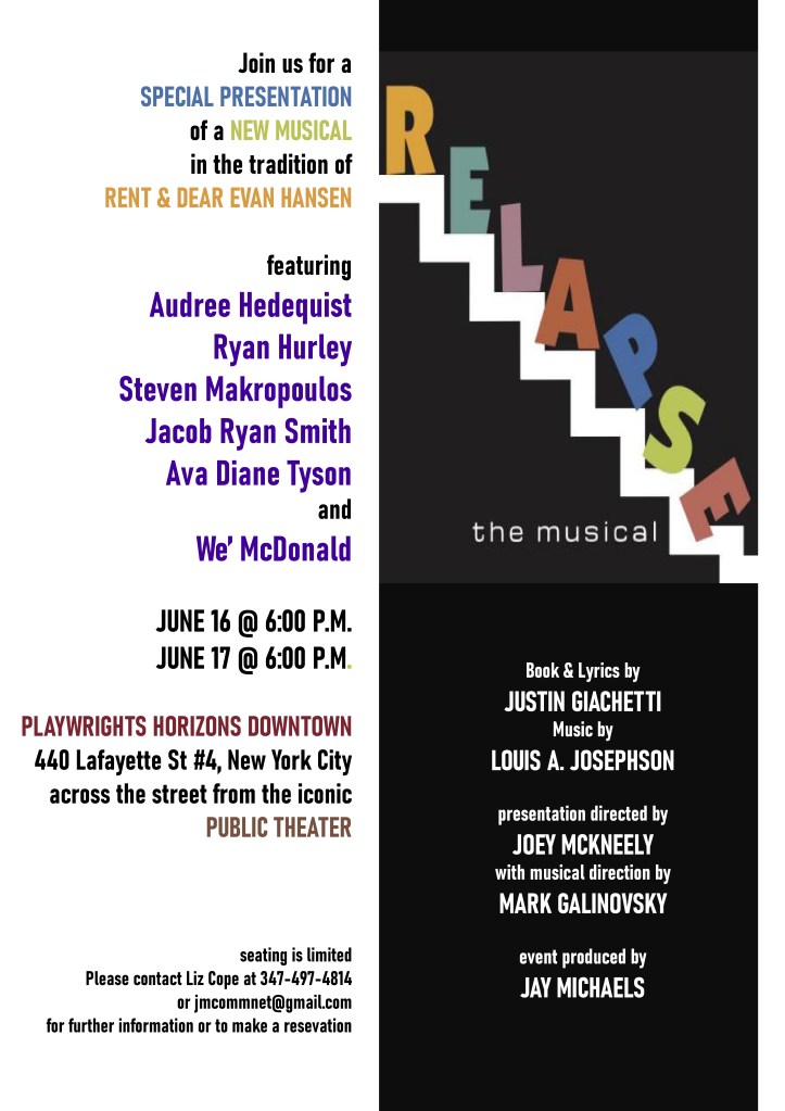 This production was a long time in the making from adolescence to adulthood. The impetus behind writing it was to create something new and distinct. “After writing a children’s musical with Justin in middle school, I was eager to try something completely different. Little did I know this work would end up being very meaningful to me and help me find my voice. Having started the piece in my freshman year of high and working on it up until my last year of undergrad, Relapse captures how my perspective on life experiences have changed over time.