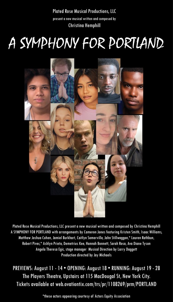 Christina Hemphill is the writer and composer for an exciting new musical opening in August called A Symphony for Portland. This multi-instrumentalist and singer marched her way through high school with a trumpet in hand. The key to her success has literally been the keys. For the past decade she has added composing to all her other musical talents. “I am primarily a musician, a pianist and classically trained organist. I played trumpet in high school marching band. I sang in a symphonic choir, and managed large church music programs. In the past ten years I’ve been composing.”