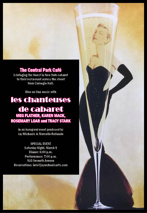 The Central Park Café is bringing the finest in New York cabaret to their restaurant across the street from Carnegie Hall. les chanteuses de cabaret featuring Meg Flather, Karen Mack, Rosemary Loar and Tracy Stark will be presented in an inaugural event produced by Marcello Rollando & Jay Michaels