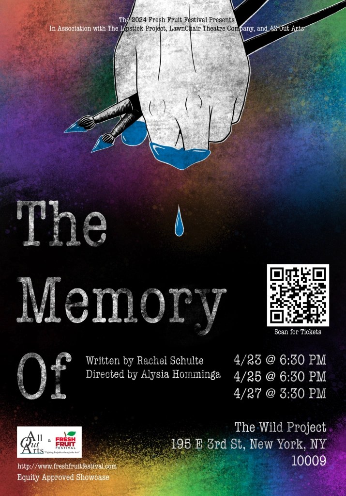 The Memory Of is directed with a flourish by Alysia Homminga, with deft lighting design by Lauren Lee. It is presented at the Wild Project as part of the 2024 Fresh Fruit Festival, in Association with The Lipstick Project, LawnChair Theatre Company, and All Out Arts.