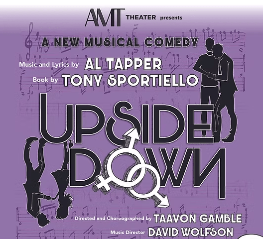 Upside Down has music and lyrics by Al Tapper, book by Tony Sportiello, directed by Taavon Gamble and music direction by David Wolfson. The cast includes Bernie Baldassaro, Patrick Brady, Mike Ferlita, Jake Foster, Lauren Gemelli, Kira Sarai Helper, Ashanti J’Aria, Matthew Liu, Kelli Maguire, Stephanie Maloney, Stanley Martin, Gina Milo, Brogan Nelson and Josh Powell.