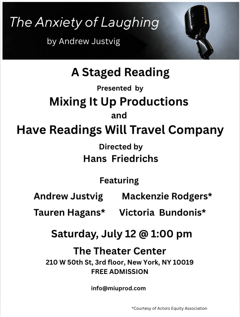 Slated for including in the July 2026 festival, a special staged reading presented by Mixing It Up Productions and Have Readings Will Travel Co. will be presented Saturday, July 12 @ 1:00 p.m. at The Theater Center, 210 West 50th Sreet, 3rd Floor, New York City. For info and rsvp: info@miuprod.com.