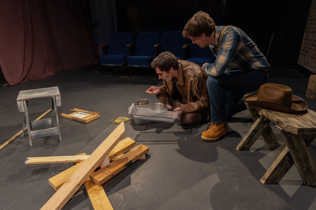 Fittingly first up is 1913’s A Wife for a Life, O’Neill’s debut play. This somewhat obscure work is known for being an early use of the trope of men in conversation about an offscreen woman. In this short but bittersweet piece, gold miner Sloan (Jonathan Beebe) sits at a campfire in the Arizona desert, waiting for his young buddy and colleague Jack (Travis Bergmann). But Pete (Paul Maurizio) arrives first, with a telegram for Jack, who exuberantly arrives with a bit of the gold they’ve been counting on discovering. Grabbing a bottle to share, Jack toasts to the gold mine he has named “Yvette”—and hearing that name makes Sloan go cold. It is here that the dramatic tension of Wife rises to a 10, as Sloan hears about Jack’s recent romance, and comes to a devastating realization. He has to turn his face away from Jack as he comes to terms with the fact that this man—who once saved his life—was also the one who helped upend it. Sloan grows to Hamlet-like intensity and indecision as he weighs forgiveness against revenge and ponders his own responsibility in the dissolution of his marriage.
