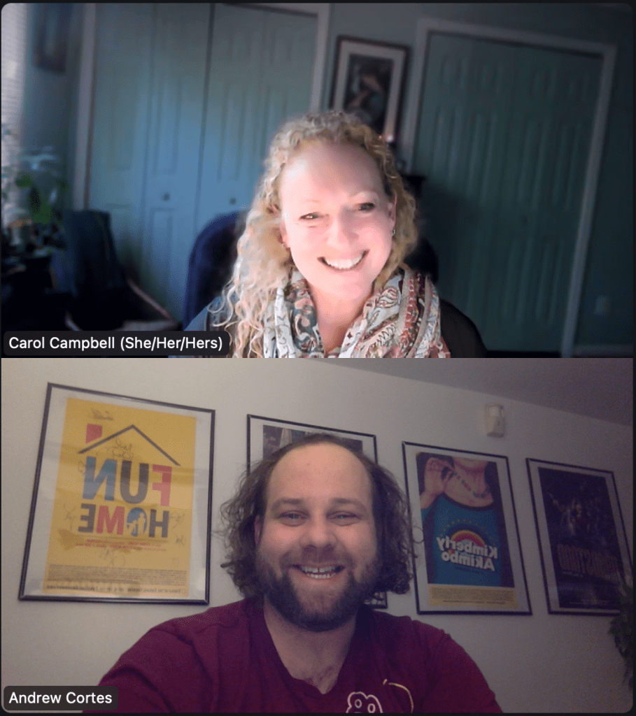 Here is Carol chatting with Andrew Cortes, the host of STAGE WHISPER PODCAST